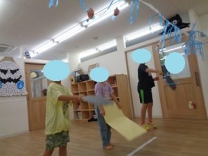 うちわを使って、おばけを落とすゲームに挑戦!