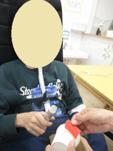 手に紙コップを入れて固定させ、先生と折り紙を貼ったり一緒に目や鼻を貼ったりしました!
