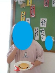 お肉や野菜をたくさん乗せて、嬉しそうな表情があ